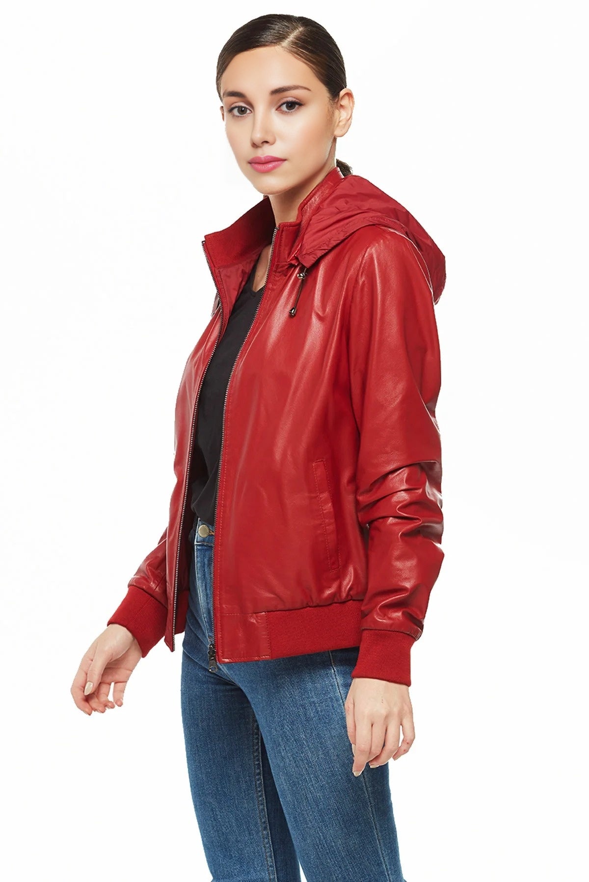 Alison Red Bomber Leather Jacket with Hood For Women