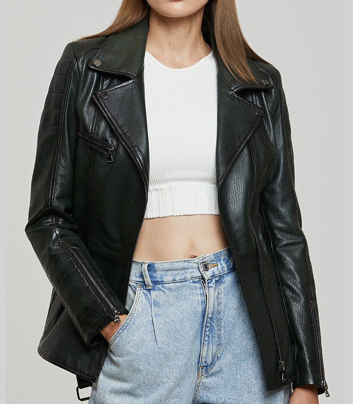 Introducing our Green Stylish Leather Jacket for Women, a captivating fusion of fashion and functionality. This cool and slim-fit jacket is crafted from premium sheepskin leather with a distressed jackets finish, exuding timeless elegance. The YKK zipper closure ensures durability, while the center belt adds a touch of sophistication. With four pockets for your convenience, including two upper side pockets and two lower side pockets, and a sleeve zip for added flair, this jacket is the perfect choice for modern womenseeking style and versatility.