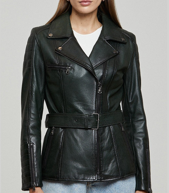 Audrey Green Stylish Leather Jacket With Center Belt For Women