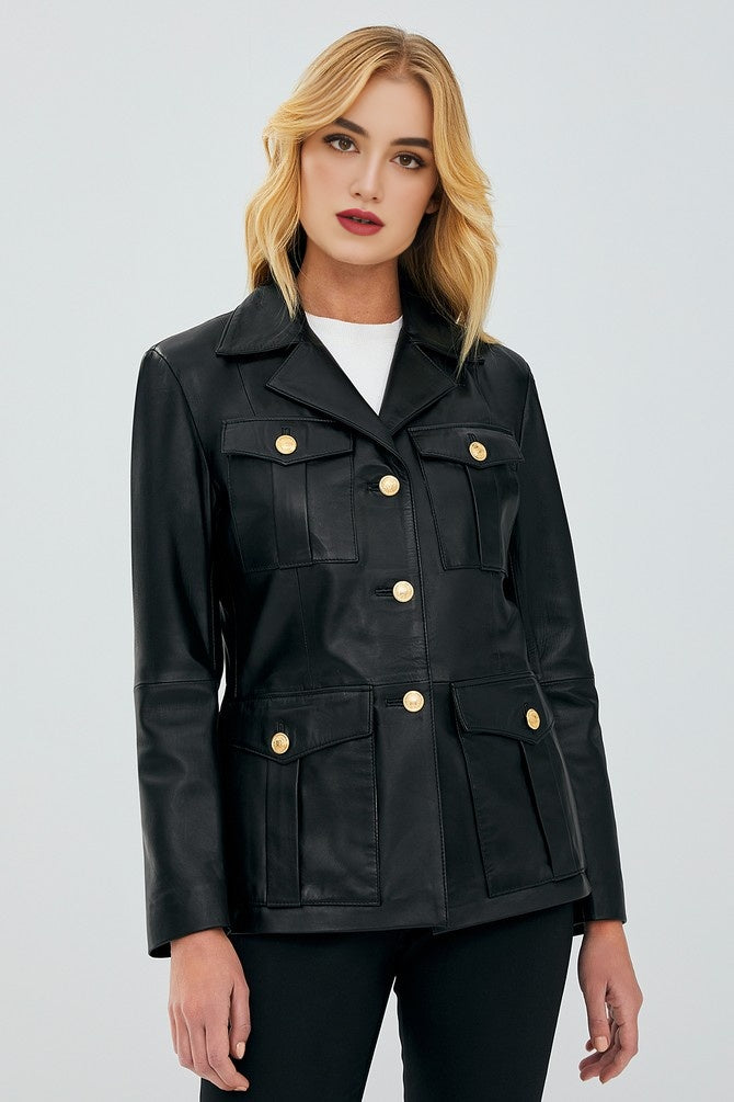 Introducing the Bella Women's Black Leather Coat - a fusion of timeless style and practicality. This stunning coat features a button closure that adds a classic touch to your ensemble. Crafted from premium distressed sheepskin. With 2 chest button pockets and 2 side button pockets, it effortlessly combines fashion with functionality, offering convenient storage options for your essentials. Crafted with attention to detail, the black leather exudes a sleek and versatile charm. YKK zip for durability. Whether you're heading to the office or going for a casual outing, this coat complements your look with elegance and ease. Elevate your wardrobe with this essential piece of outerwear.
