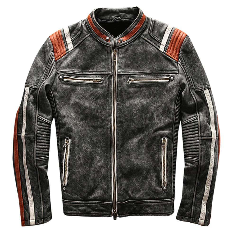 Unveil your rebellious spirit with our Black Distressed Leather Jacket for Men. Crafted from premium sheepskin leather, it merges ruggedness and refinement seamlessly. The jacket'sedgy personality is enhanced by the double-color stripes, setting you apart in style. With two upper side and two lower side pockets, this motorbikeleather jacket delivers both utility and flair. The YKK zipper ensures durability, perfect for your daring adventures on the open road.