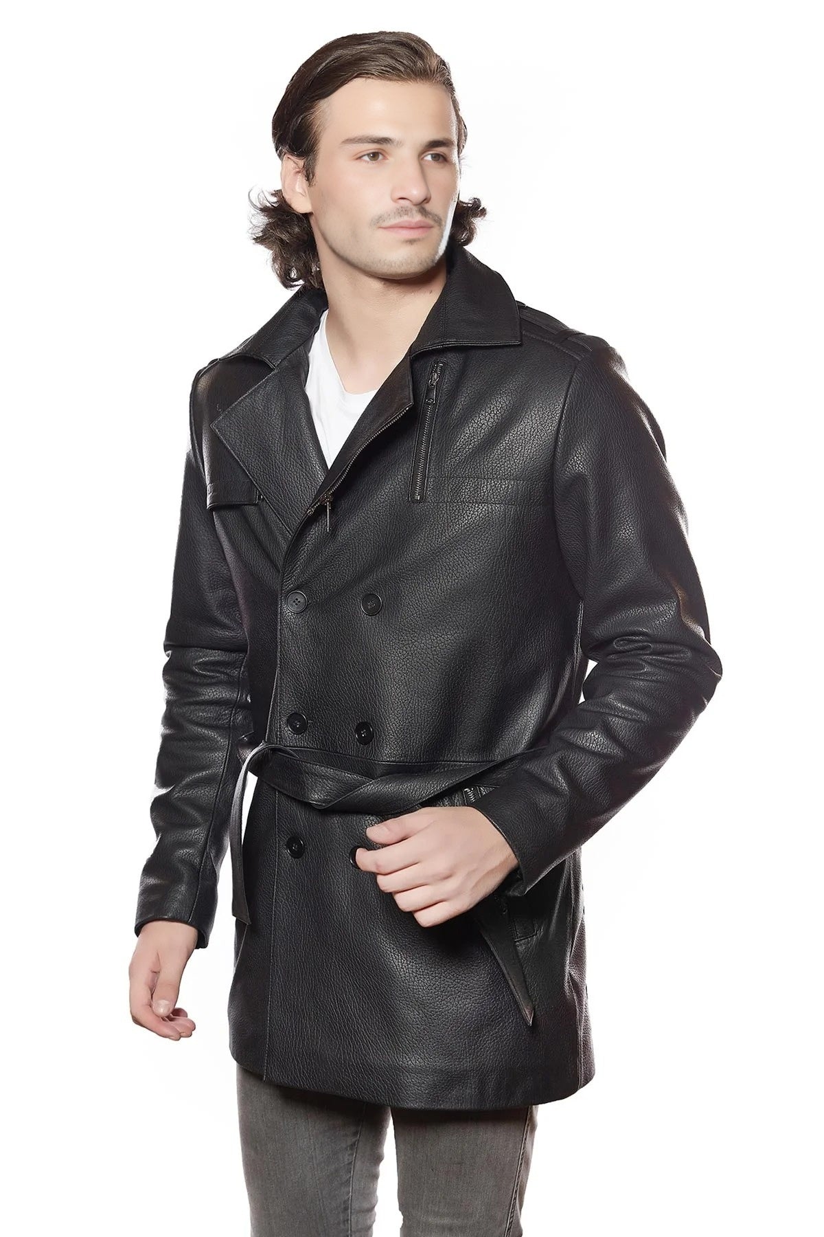 This black leather jacket for men is crafted from high-quality distressed leather, giving it a rugged yet sophisticated look. Designed with a slim fit, it accentuates the male physique while providing comfort and style. The front closure features a button design, adding a touch of classic elegance. Additionally, a belt closure at the center enhances its fit and aesthetic appeal, ensuring it stays snug and secure. Made from pure sheepskin leather, this jacket is not only durable but also exceptionally soft to the touch, providing the wearer with both warmth and luxury. Ideal for both casual and semi-formal occasions, this jacket is a versatile addition to any wardrobe. Its timeless design ensures it remains a staple piece for years to come, while the distressed leather adds a unique, personalized touch to each jacket. Perfect for men who appreciate style and quality, this jacket effortlessly combines fashion with functionality.