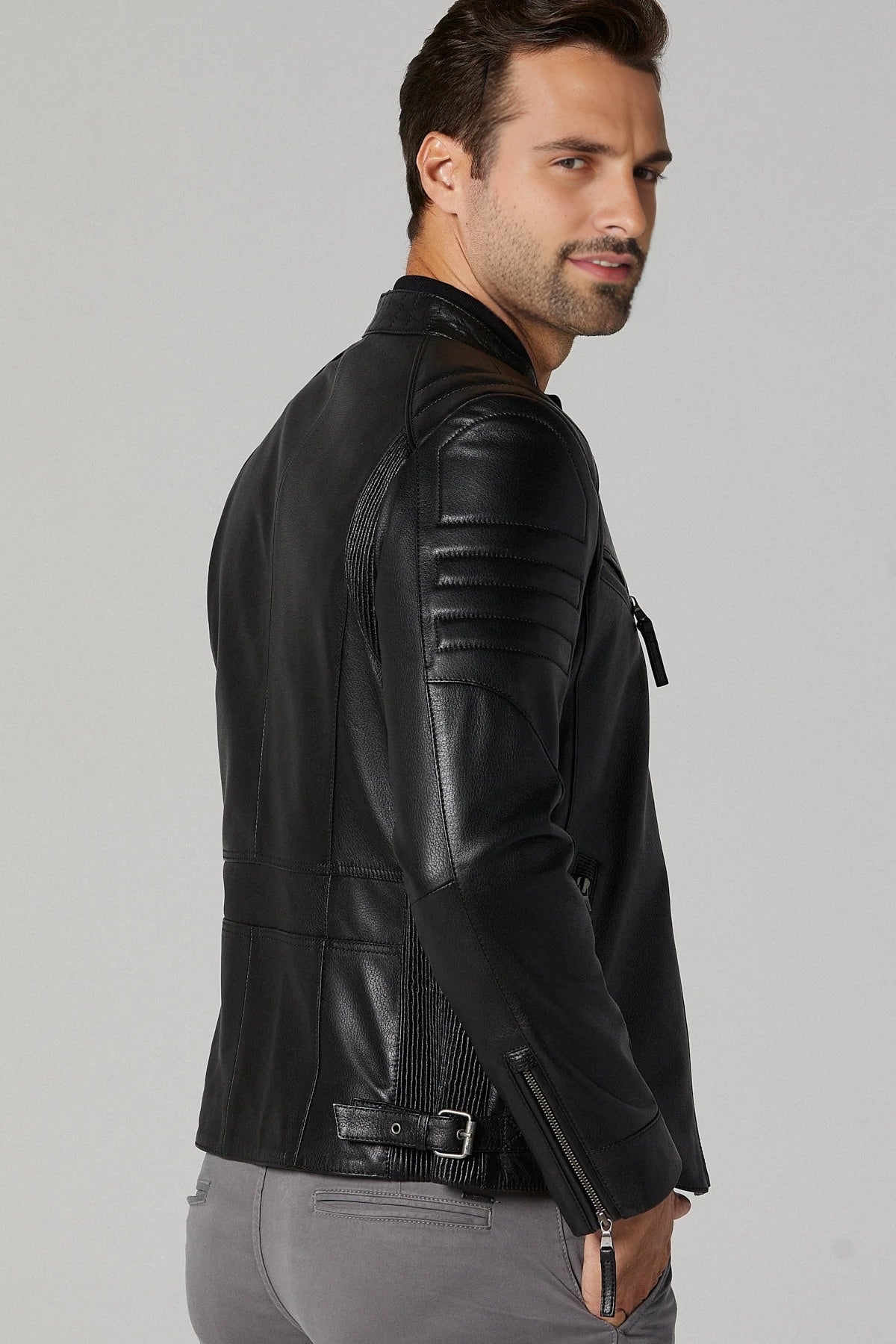 Introducing the epitome of cool and timeless fashion – the Black Stylish Leather Jacket for Men. Crafted from luxurious sheepskin with a distressed leather finish, this jacket is a work of art, embodying rugged elegance. Its YKK zipper closure not only ensures durability but also adds an edgy touch to your look.
