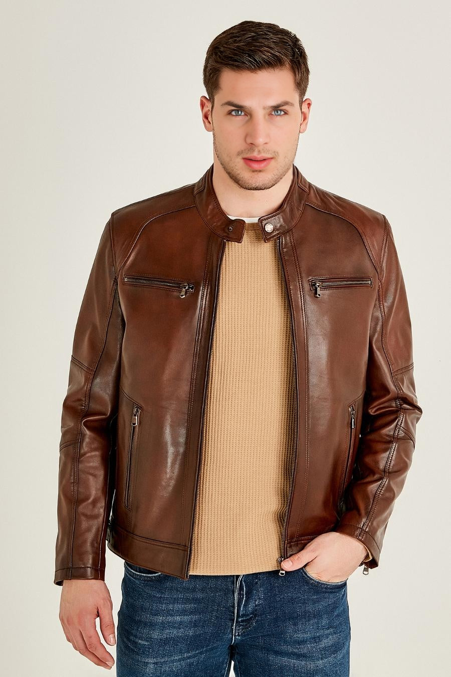Introducing the Men'sBrown Distressed Leather Jacket, a fusion of rugged charm and timeless style. Crafted from premium distressed leather and plush sheepskin, it's a testament to craftsmanship. The YKK zipper ensures durability, while the front zipper closure adds modernity. With two upper and two lower pockets, this biker racer jacket strikes the perfect balance between fashion and functionality.