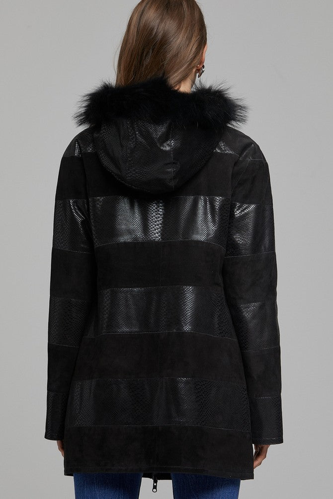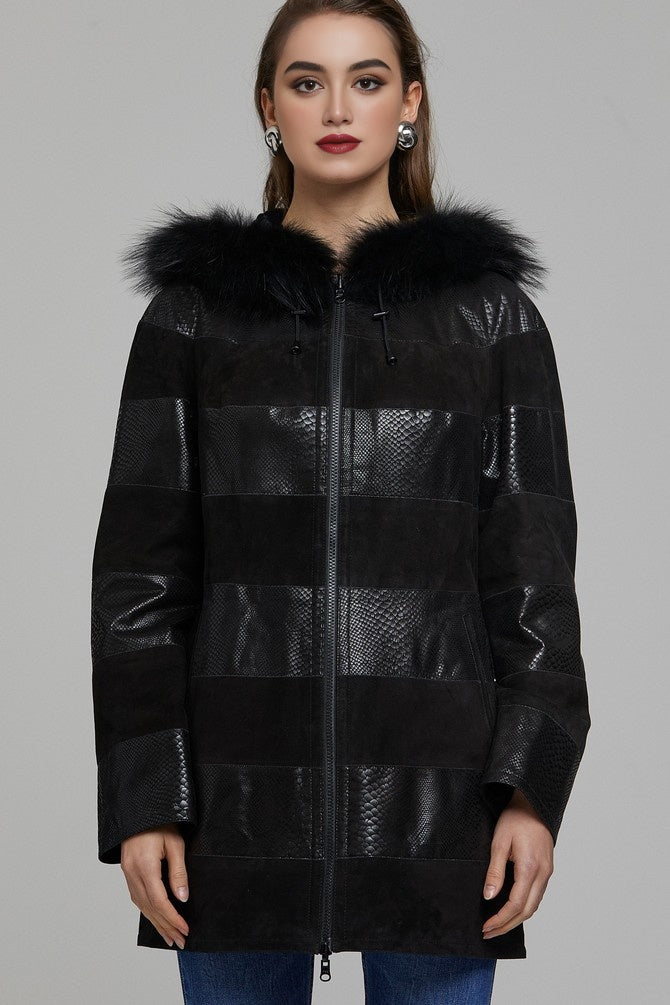 Step into sophistication with our Black Leather Coat for women, a winter wardrobe essential blending style and warmth. Crafted from distressed sheepskin, the luxurious coat boasts a YKK zip for durability. The fur hood and collar add a touch of elegance, framing the face with cozy charm. With two hand pockets on both sides, this coat is both practical and fashionable, offering a perfect blend of comfort and style.