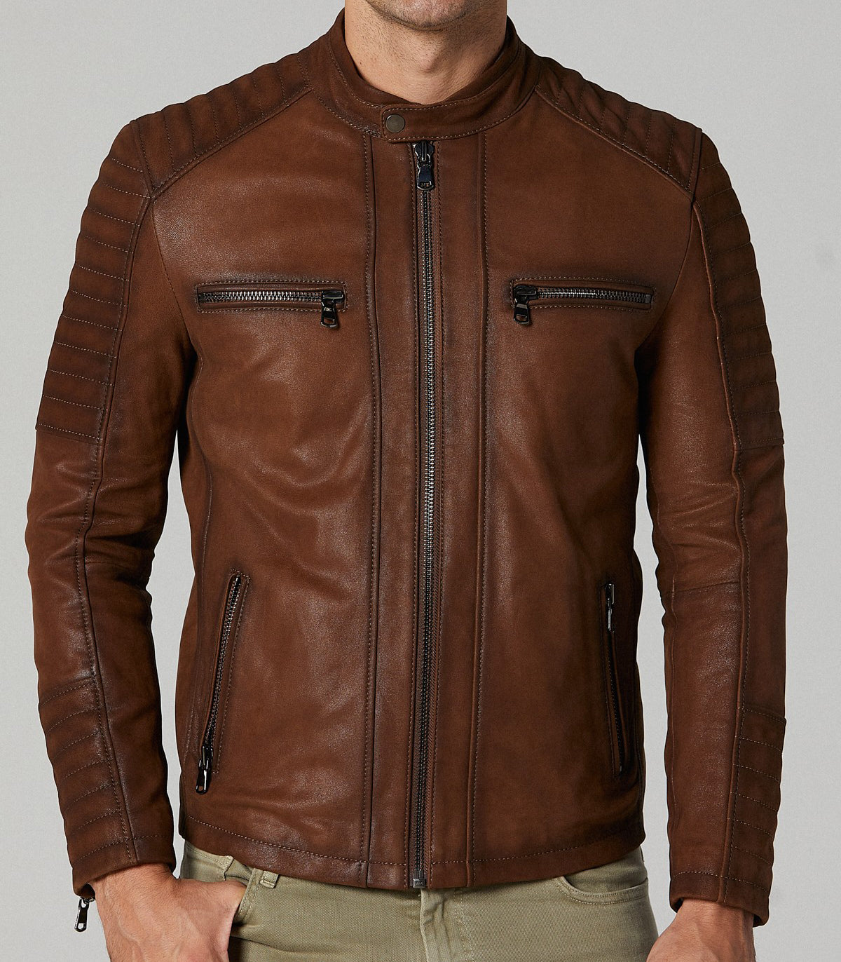 With four spacious pockets—two on the upper side and two on the lower side—this jacket offers ample storage without compromising its sleek silhouette. Its distressed leather finish adds character and depth to its design, making it a standout piece in your wardrobe.