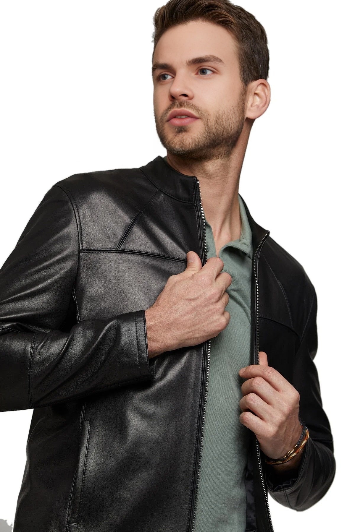 Introducing the ultimate black leather jacket for men, crafted from high-quality distressed sheepskin leather. This slim-fit biker jacket embodies the perfect blend of rugged style and modern sophistication. The distressed leather not only gives a unique, vintage look but also ensures durability and comfort. The front zipper closure adds a sleek touch, making it easy to wear and providing a secure fit. Equipped with YKK zippers, renowned for their reliability and smooth operation, this jacket stands out in quality and functionality. The lower side features two convenient pockets, while the inner side also offers two additional pockets, providing ample space to carry your essentials. Designed for the modern man who appreciates timeless style and practicality, this jacket is perfect for any occasion, whether you’re hitting the road or heading out for a night on the town. The slim fit enhances your silhouette, giving you a sharp and polished appearance. Embrace the biker spirit with this stylish and versatile leather jacket, a must-have addition to any wardrobe.