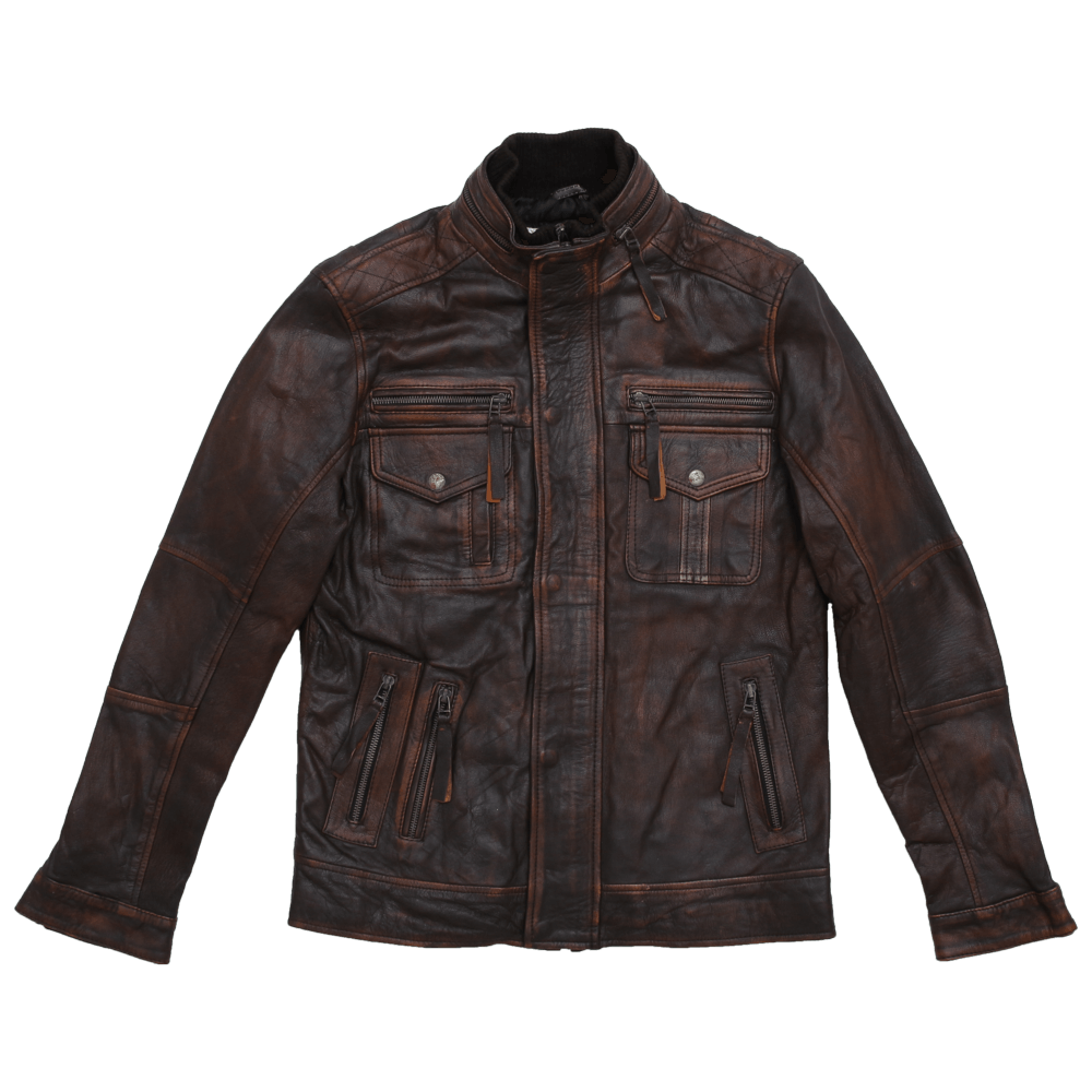 Distressed Brown Leather Jacket With Double Collar For Men