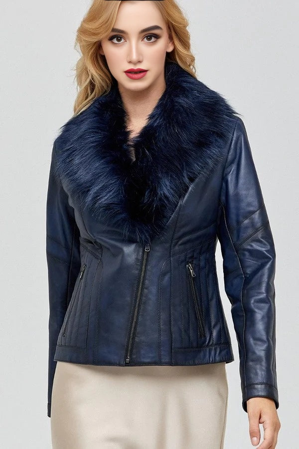 Isabella Dark Blue Leather Jacket With Fur Collar For Women