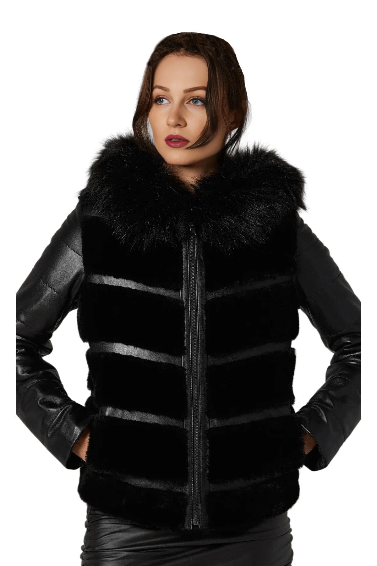 Kinsley Black Women Front Fur Leather Jacket With Hood