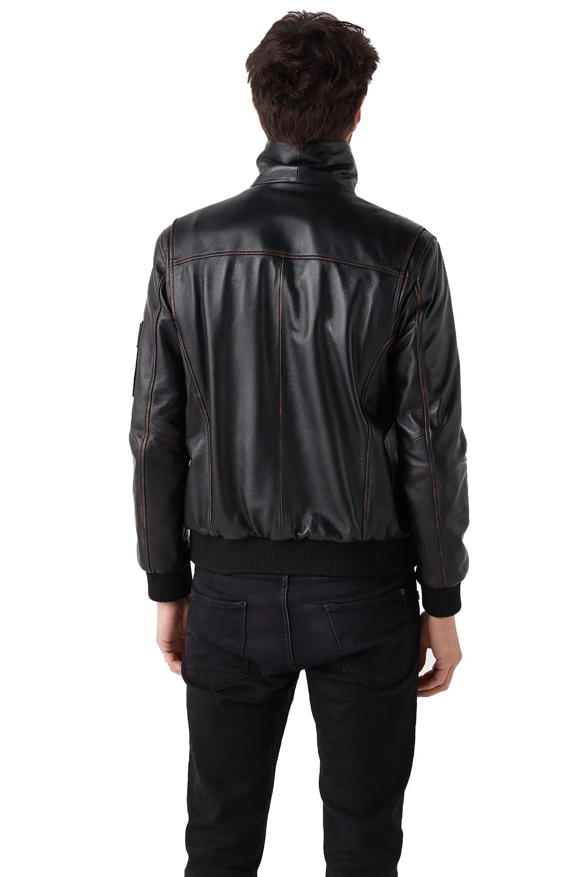 Elevate your biker style with this men's black bomber leather jacket, crafted from premium distressed leather sheepskin for a rugged yet sophisticated look. Designed to offer a perfect balance between fashion and functionality, this slim-fit jacket contours to your body, ensuring a sleek, modern silhouette. Featuring a full front zipper closure with durable YKK zippers, it guarantees secure and long-lasting wear. The two lower side pockets provide easy access to essentials, while the inner two pockets offer additional storage space for valuables. Whether you're on the road or out for casual wear, this jacket delivers an unmistakable biker edge. The distressed leather finish adds a vintage touch, making it ideal for those who appreciate timeless style with a rebellious twist.