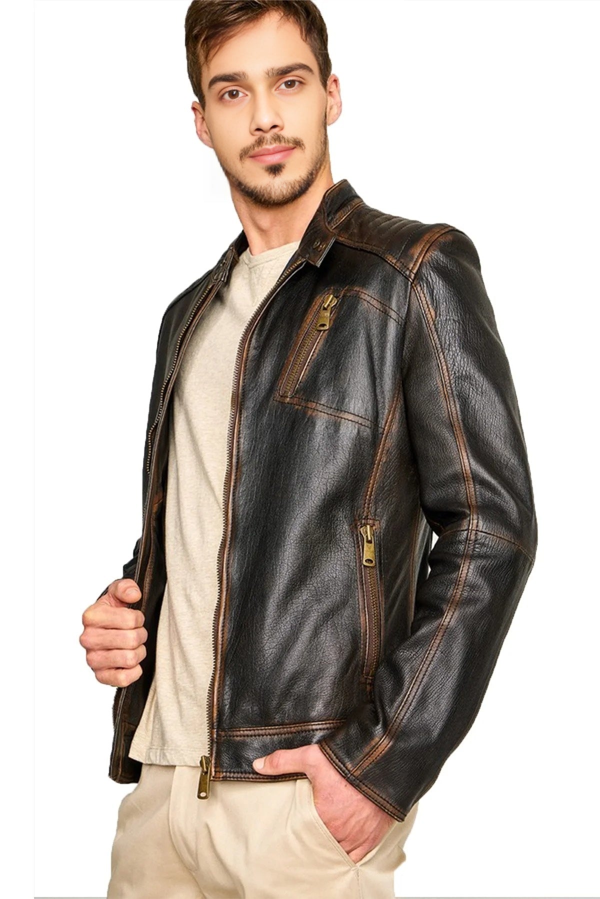 Introducing the men's brown wax leather jacket, a timeless piece crafted from the finest distressed sheepskin leather. This café racer style jacket blends rugged charm with modern sophistication. The distressed finish gives it a unique vintage appeal, enhancing its character over time. Designed for durability and style, the jacket features a front zipper closure with premium YKK zippers, ensuring smooth functionality and a secure fit. Two lower side pockets provide convenient storage, while two inner pockets offer additional security for valuables. An upper chest pocket adds to its utility, making it practical for everyday essentials. The slim fit silhouette contours the body elegantly, making it versatile for both casual and semi-formal occasions. Whether worn over a t-shirt or layered with a sweater, this jacket effortlessly elevates your look while providing comfort and warmth.