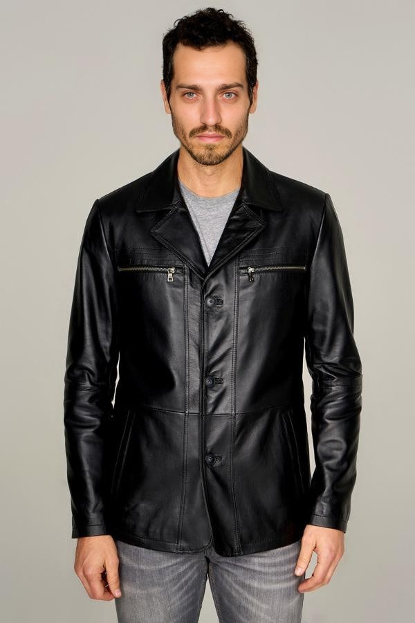 Introducing our Men's Black Racer Leather Jacket, a sleek and slim-fit masterpiece. Crafted from premium distressed leather, it exudes a rugged charm. The front button closure adds a touch of vintage sophistication. This jacket features four functional pockets, two on the upper side and two on the lower side, making it both stylish and practical.