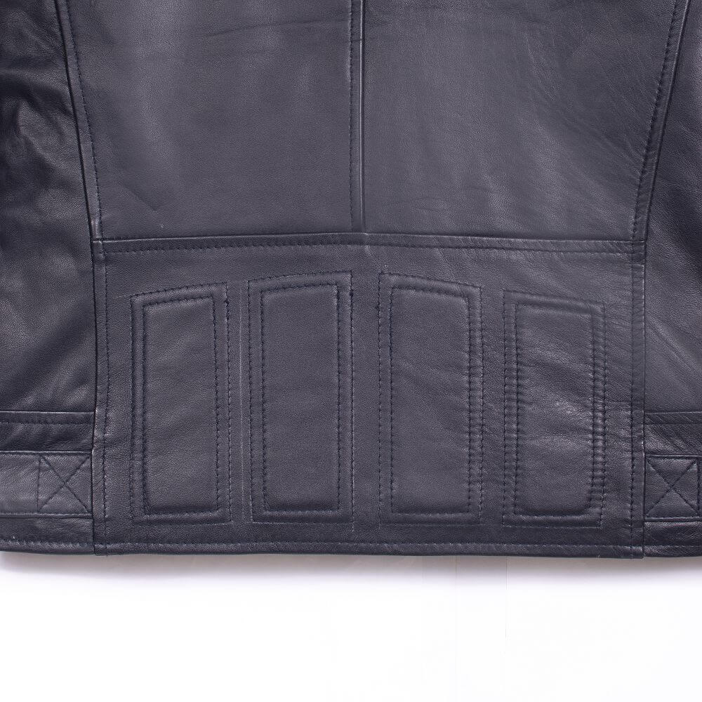 The functional design includes two hand pockets, providing both convenience and added warmth. Embrace the classic biker racer vibe with the sleek silhouette, while the sleeve zip closure adds a touch of edginess. The combination of black and blue colors lends a unique, dual-tone allure, setting this jacket apart as a bold fashion statement.