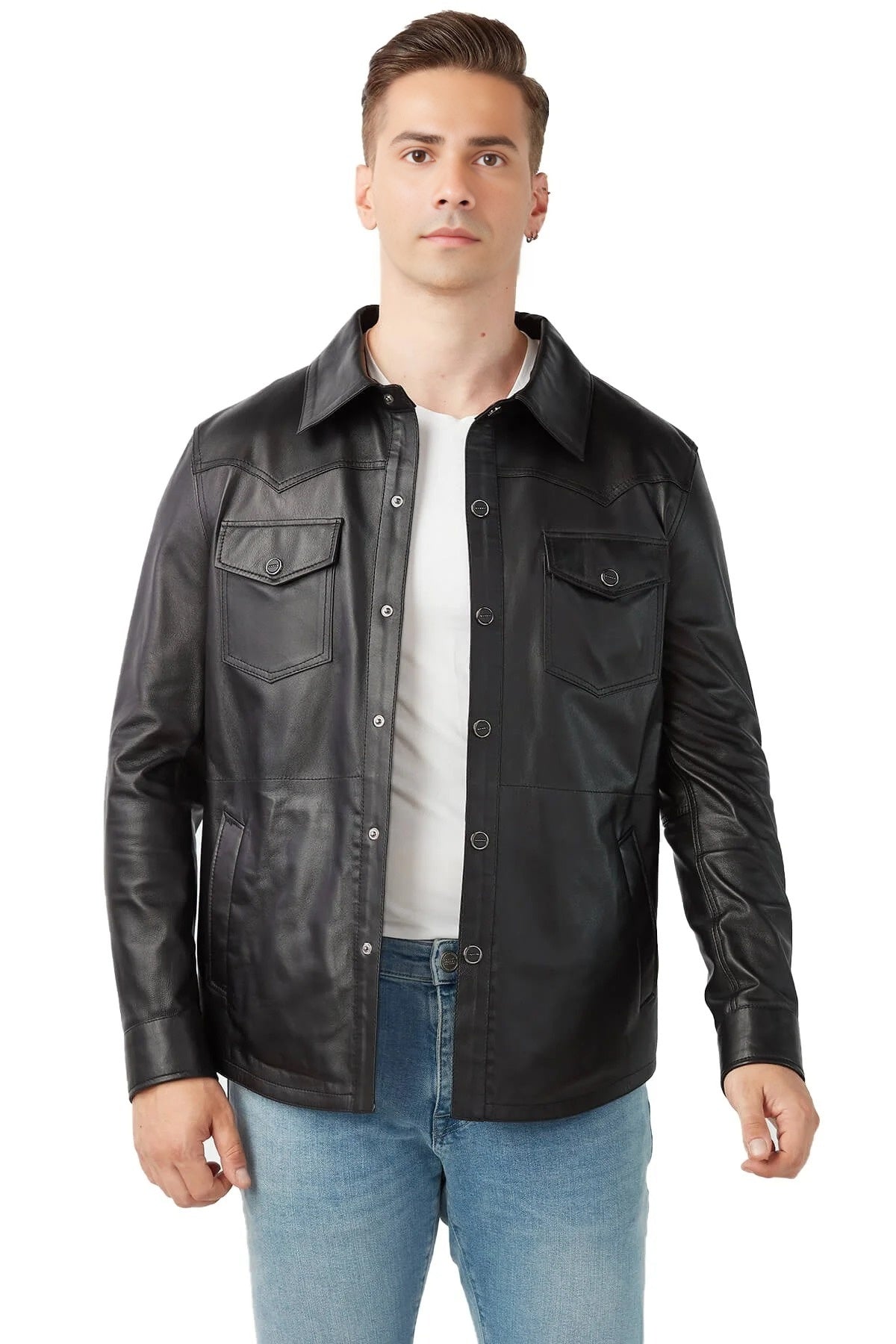 The front button closure not only enhances the jacket’s stylish look but also offers secure fastening, while the YKK zippers on the pockets guarantee long-lasting performance. With two lower side pockets and two upper side pockets, this jacket provides ample storage space for your essentials. Designed specifically for motor biking, it combines functionality with fashion, making it a versatile addition to your wardrobe. The shirt collar adds a touch of classic charm, balancing the ruggedness of the distressed leather with a sophisticated edge. Whether you’re cruising the city streets or embarking on a weekend adventure, this black leather jacket is designed to keep you looking sharp and feeling confident.