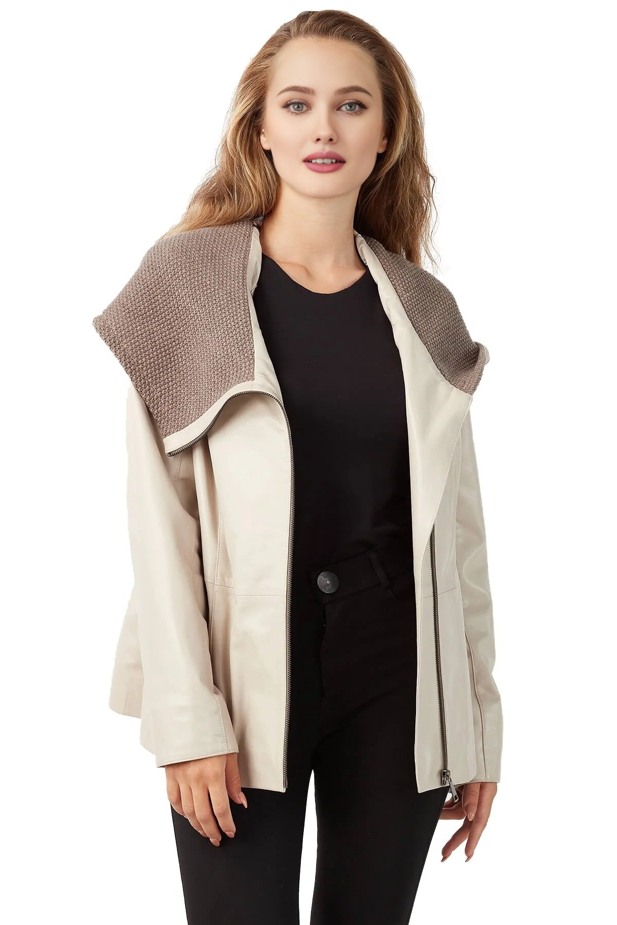 A beige leather jacket for women with a stylish hood, crafted from distressed leather, is a timeless addition to any wardrobe. This café racer rider jacket combines elegance and ruggedness, ideal for both casual and semi-formal occasions. Made from pure sheepskin, it ensures a soft, comfortable fit while offering durability. The slim fit design accentuates the wearer’s silhouette, providing a sleek and modern look. The front zipper closure adds a touch of contemporary flair, complemented by two lower side pockets for practicality and style. All zippers, including those on the pockets and the front closure, are high-quality YKK, ensuring smooth operation and longevity. The distressed leather finish gives the jacket a unique, vintage appeal, making it a standout piece in any collection. Whether paired with jeans for a casual day out or layered over a dress for a night out, this jacket effortlessly enhances any outfit. Its combination of functionality and style makes it a versatile choice for fashion-forward individuals seeking both comfort and sophistication in their outerwear.