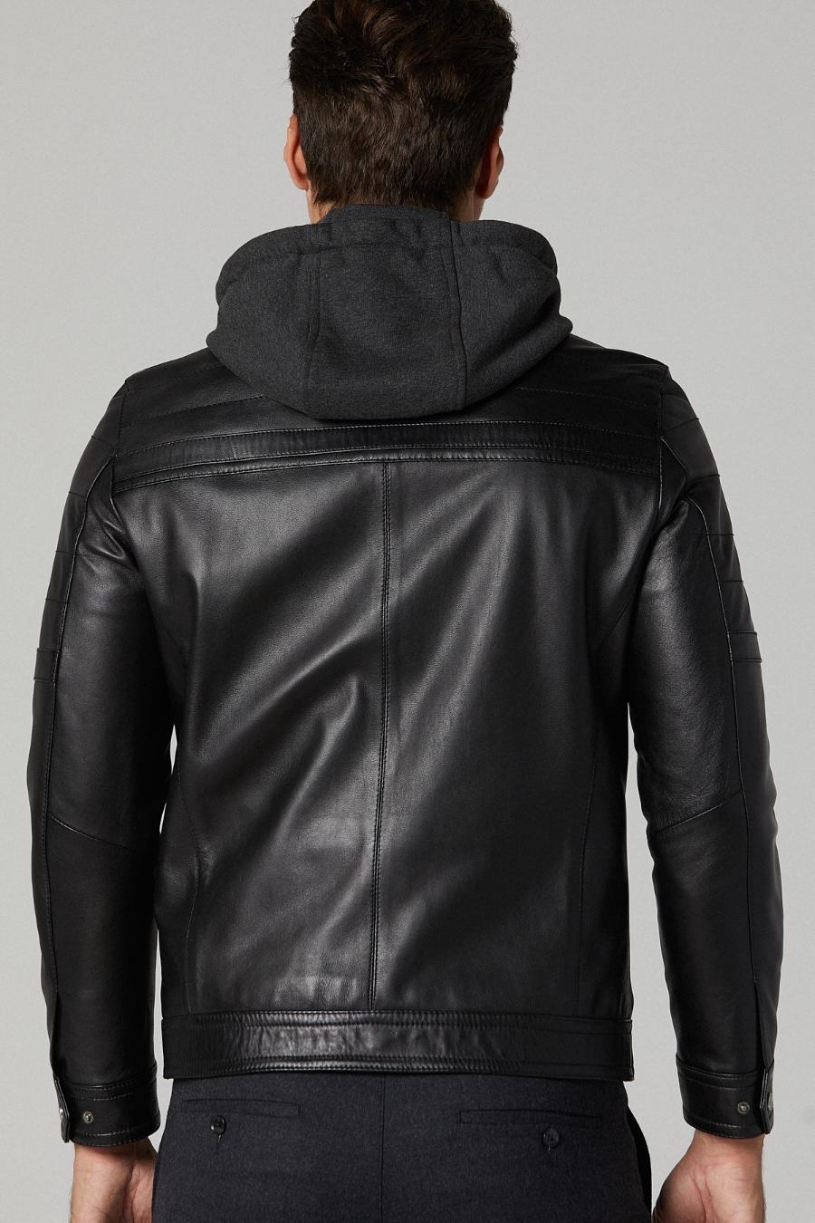 Introducing our Men's Black Stylish Leather Jacket with Hoodie, a harmonious fusion of urban flair and rugged sophistication. Crafted from premium distressed leather and enriched with plush sheepskin, it exudes both durability and comfort. This versatile jacket features a front YKK zipper closure for effortless style and practicality, while the two down side pockets and two upper side pockets provide ample storage space for your essentials.