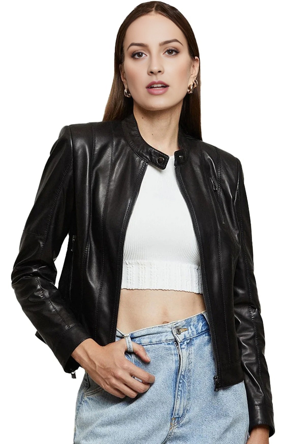 Unleash timeless style with the Women’s Black Leather Jacket, a masterful blend of classic design and modern functionality. Crafted from high-quality distressed leather sheepskin, this jacket exudes a rugged yet sophisticated appeal. The slim fit accentuates your silhouette, while the front zipper closure with premium YKK zippers ensures both durability and a smooth operation. Perfect for winter travels, this jacket combines practicality with elegance, making it an essential addition to your wardrobe. The café racer design offers a nod to classic motorcycle aesthetics, while the thoughtful placement of pockets—two lower side pockets and one upper pocket—provides ample space for your essentials. Whether you're commuting through chilly weather or embarking on a travel adventure, this jacket offers warmth and style without compromise. The distressed leather finish adds a unique, vintage charm, making each piece distinctively yours. Embrace the versatility and sophistication of this black leather jacket and make a statement wherever you go.