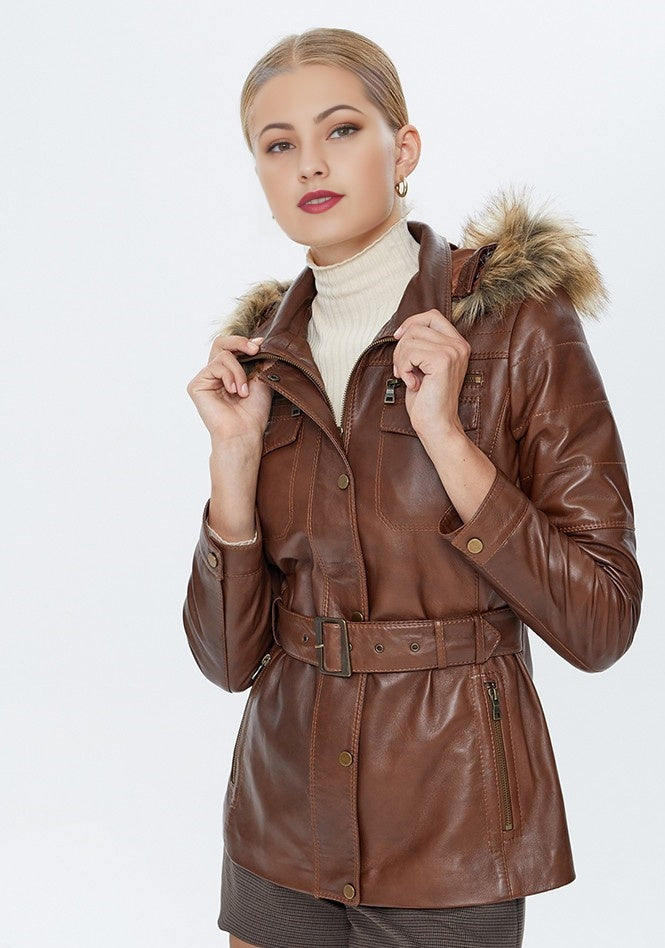 Women Waxed Brown Leather Coat With Fur Hood